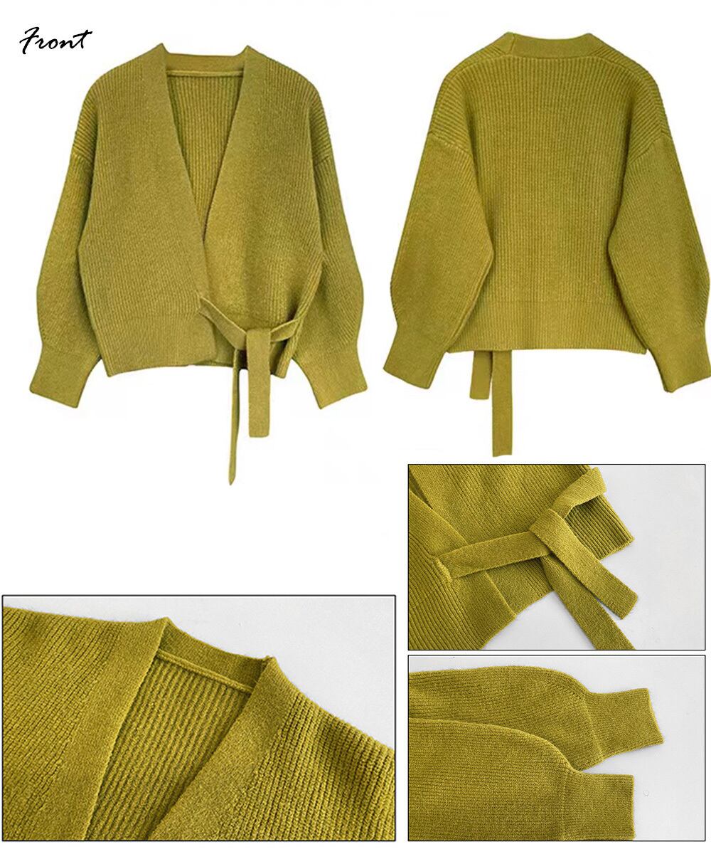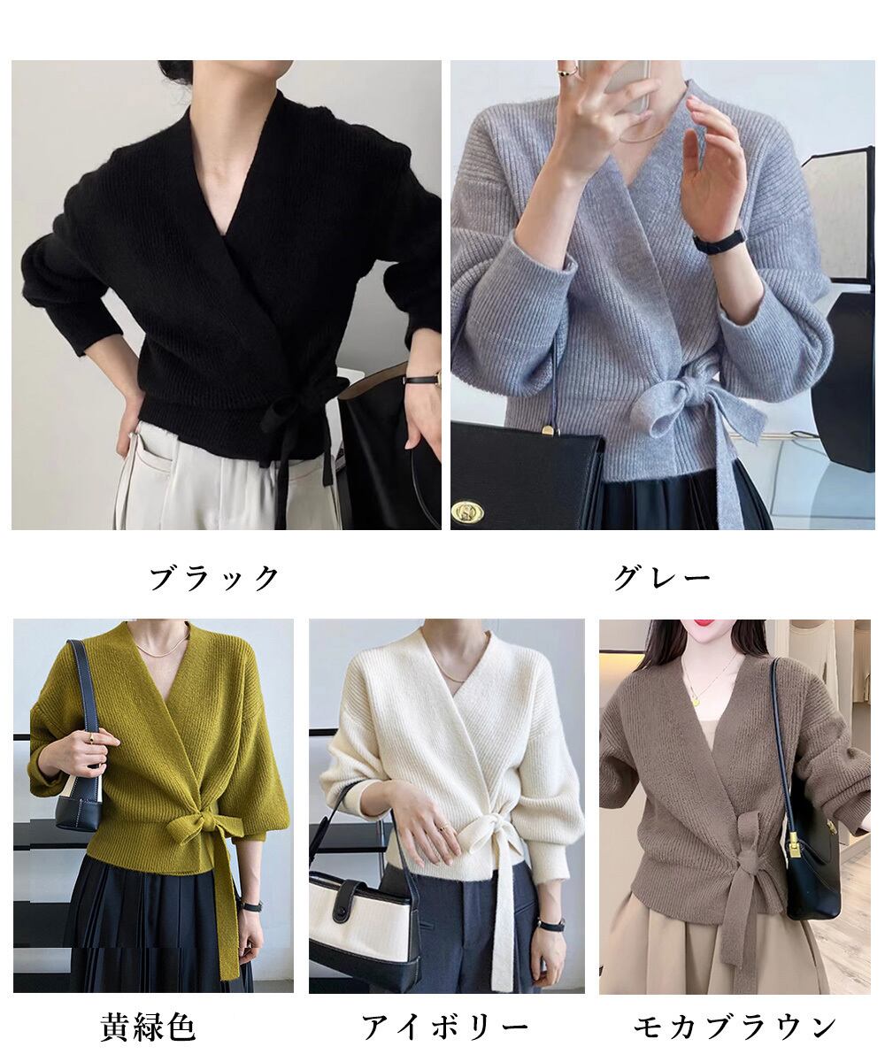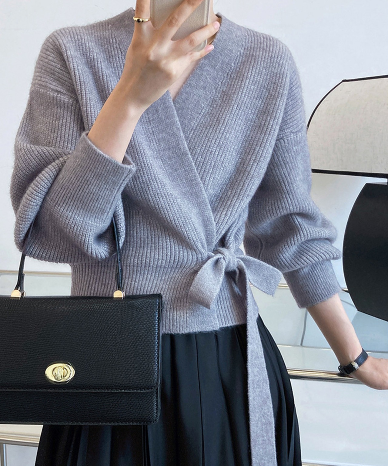Vネックでデコルテラインを美しく魅せ、女性らしさを演出する韓国新作DESIGNのカシュクールニットトップス