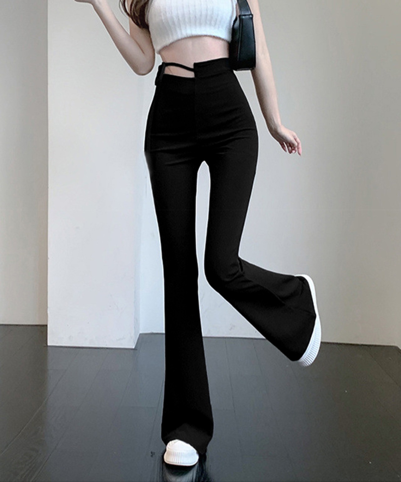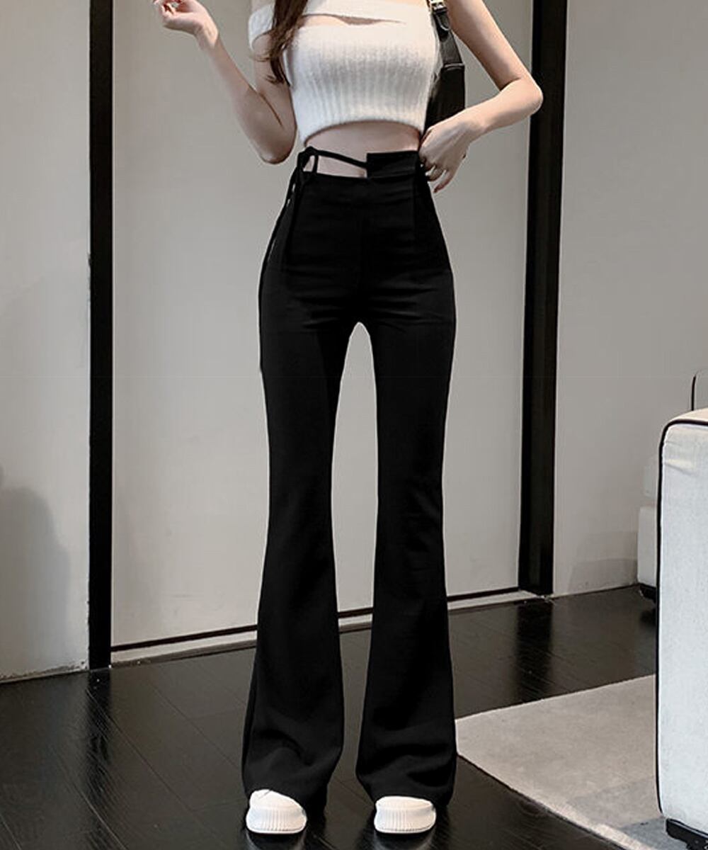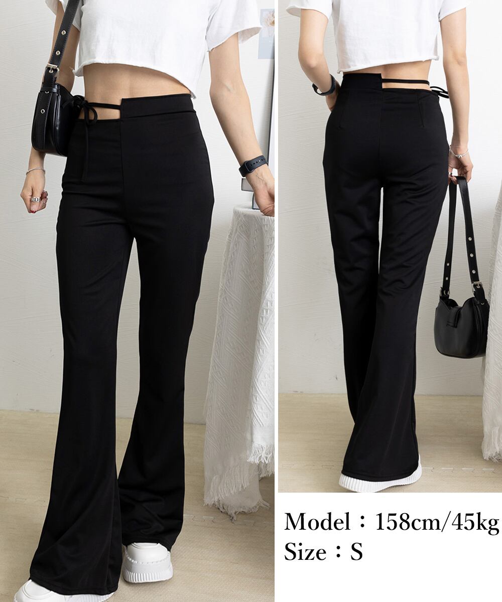 ウエスト部分に不規則で大胆なカットアウトが施され、トレンド感とセクシーさを演出するフレアスキニーパンツ